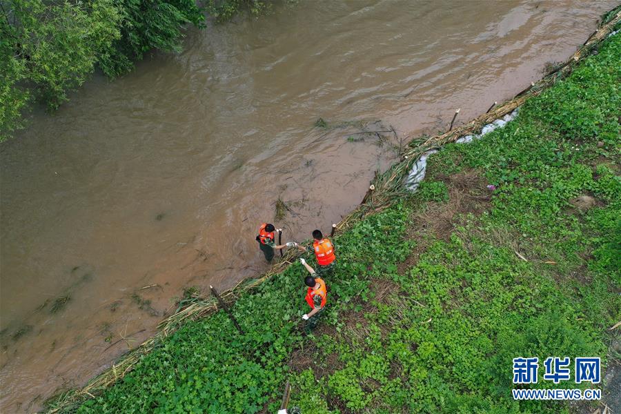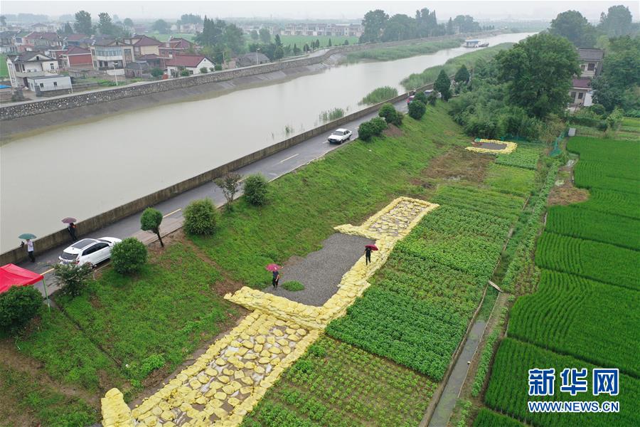 在鎮(zhèn)江市丹徒區(qū)世業(yè)鎮(zhèn)先鋒村西南大堤,中國安能集團第二工程局常州分公司防汛前置備勤隊員在用木樁固定捆好的蘆葦(7月17日攝,無人機照片)。捆蘆葦護邊坡、機器人進涵洞、“養(yǎng)水盆”防滲漏……在江蘇鎮(zhèn)江,當(dāng)?shù)馗刹咳罕姾蛯I(yè)力量,因地制宜就地取材,老辦法搭配新技術(shù),一批險情得以消除在萌芽狀態(tài)。新華社記者季春鵬攝