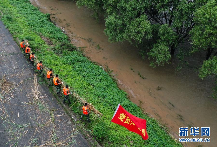 在鎮(zhèn)江市丹徒區(qū)世業(yè)鎮(zhèn)先鋒村西南大堤,中國安能集團第二工程局常州分公司防汛前置備勤隊員在捆蘆葦護邊坡(7月17日攝)。捆蘆葦護邊坡、機器人進涵洞、“養(yǎng)水盆”防滲漏……在江蘇鎮(zhèn)江,當(dāng)?shù)馗刹咳罕姾蛯I(yè)力量,因地制宜就地取材,老辦法搭配新技術(shù),一批險情得以消除在萌芽狀態(tài)。新華社記者季春鵬攝