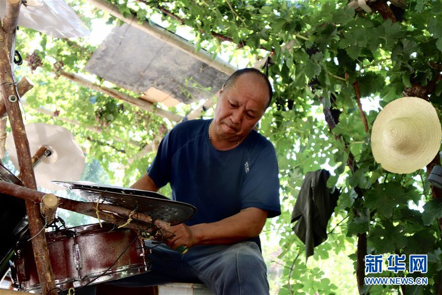 張宏遠在位于新疆瑪納斯縣的自家院落里維修自制的架子鼓(7月14日攝)。新華社記者孫哲攝