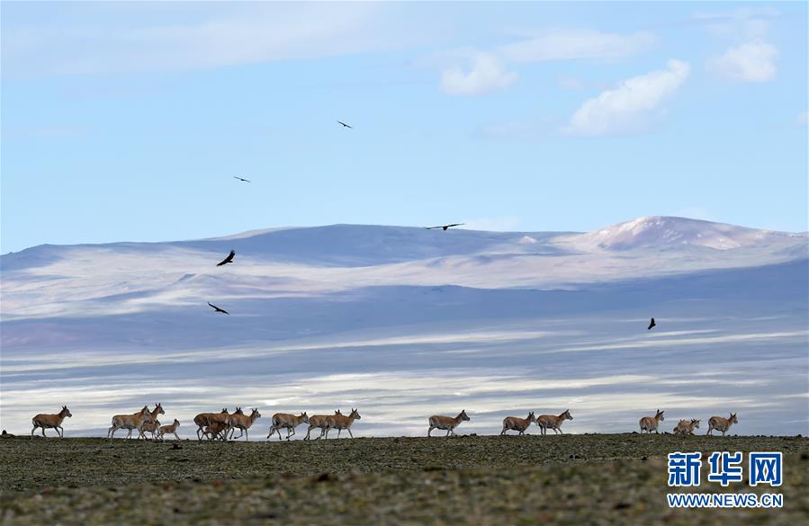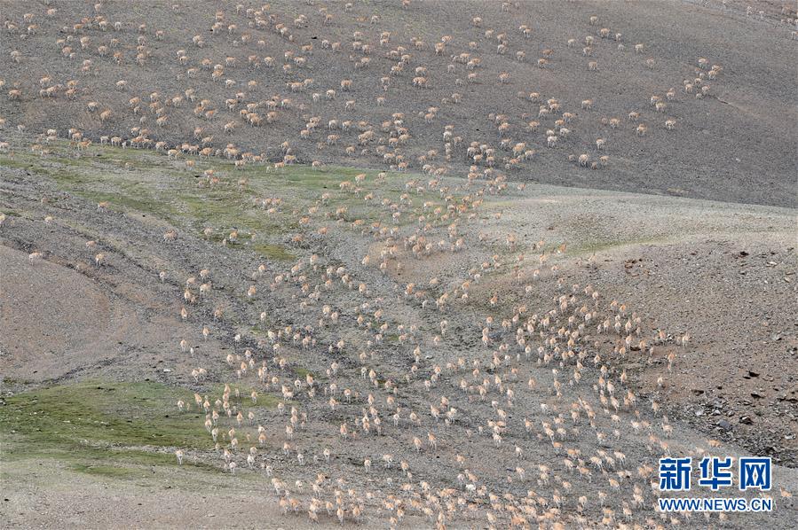 7月17日在西藏尼瑪縣榮瑪鄉(xiāng)附近拍攝的藏羚羊群。2000年,西藏羌塘自然保護區(qū)晉升為國家級自然保護區(qū)。20年來,經過西藏各級各部門的不懈努力,羌塘國家級自然保護區(qū)內的重點保護野生動物種群數量明顯增加,其中,藏羚羊種群數量由原來的5至7萬只,恢復到目前的15萬只以上。羌塘國家級自然保護區(qū)核心地帶的西藏尼瑪縣榮瑪鄉(xiāng)附近,目前就有近6萬只藏羚羊。新華社記者覺果攝