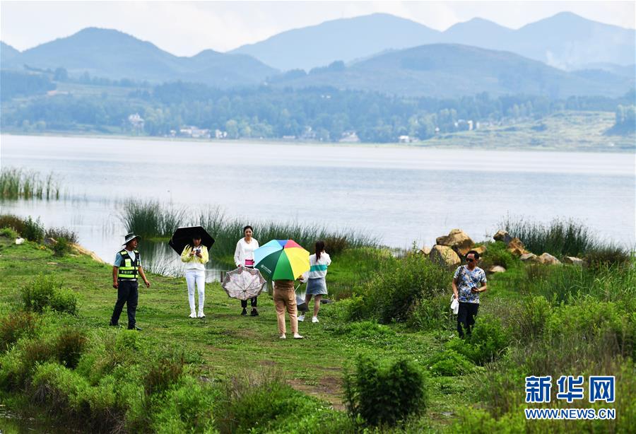 草海巡護員(左一)在勸導(dǎo)游客不要擅自進入草海保護區(qū)內(nèi)游覽(6月10日攝)。新華社記者楊文斌攝