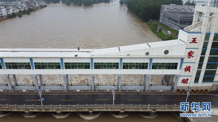 這是7月22日在安徽省阜南縣拍攝的淮河王家壩閘(無人機(jī)照片)。7月22日14時,淮河王家壩水位降至28.73米,超警戒水位1.23米,低于保證水位0.57米。新華社記者張端攝