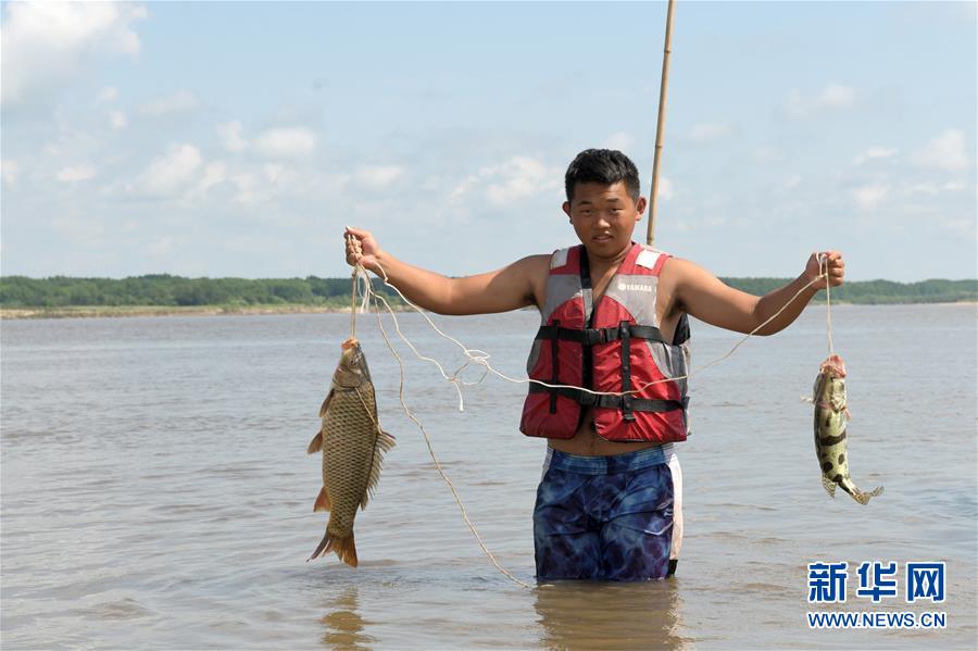 7月22日,在二道江灘地的江邊,赫哲族村民在展示剛打上來(lái)的魚(yú)。新華社記者王建威攝