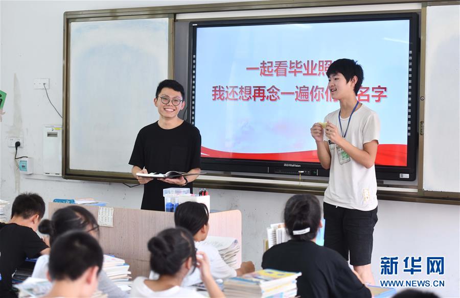 在融水苗族自治縣丹江中學(xué)1708班舉辦的送別班會上,一名學(xué)生給支教老師溫昌浩(左)送上臨別寄語(7月23日攝)。新華社記者黃孝邦攝