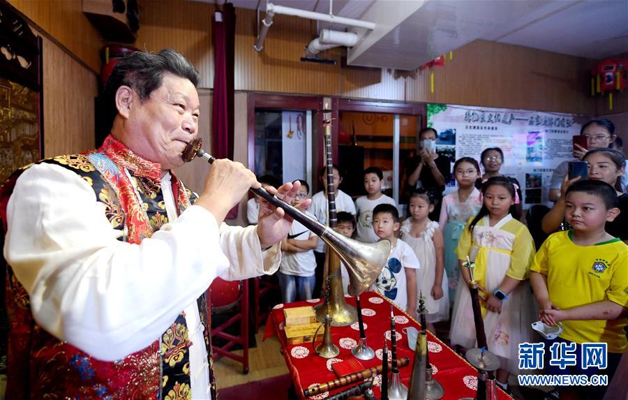 7月26日,在石家莊市橋西區(qū)休門(mén)街道休門(mén)西街社區(qū),休門(mén)吹歌傳承人付錫芬(左一)在傳授嗩吶吹奏技巧。當(dāng)日,河北省石家莊市橋西區(qū)暑期“非遺”小課堂開(kāi)班。河北省級(jí)非物質(zhì)文化遺產(chǎn)休門(mén)吹歌傳承人走進(jìn)休門(mén)街道休門(mén)西街社區(qū),為轄區(qū)小朋友講解休門(mén)吹歌歷史,傳授非遺技藝,豐富他們的暑期生活。新華社記者 王曉 攝