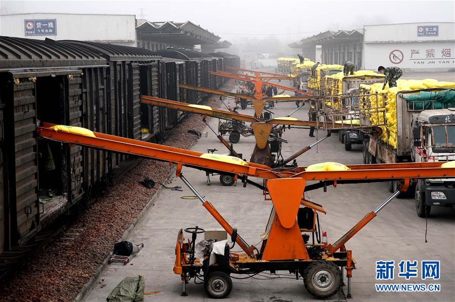 在中國鐵路鄭州局集團(tuán)有限公司開封車站,工作人員使用傳輸機(jī)裝運(yùn)春耕物資(2月13日攝)。新華社記者 李安 攝