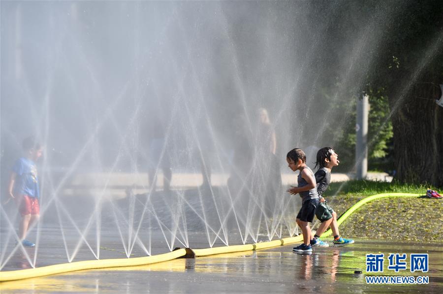 7月28日,在奧地利維也納,兒童在一處廣場戲水。新華社記者郭晨攝