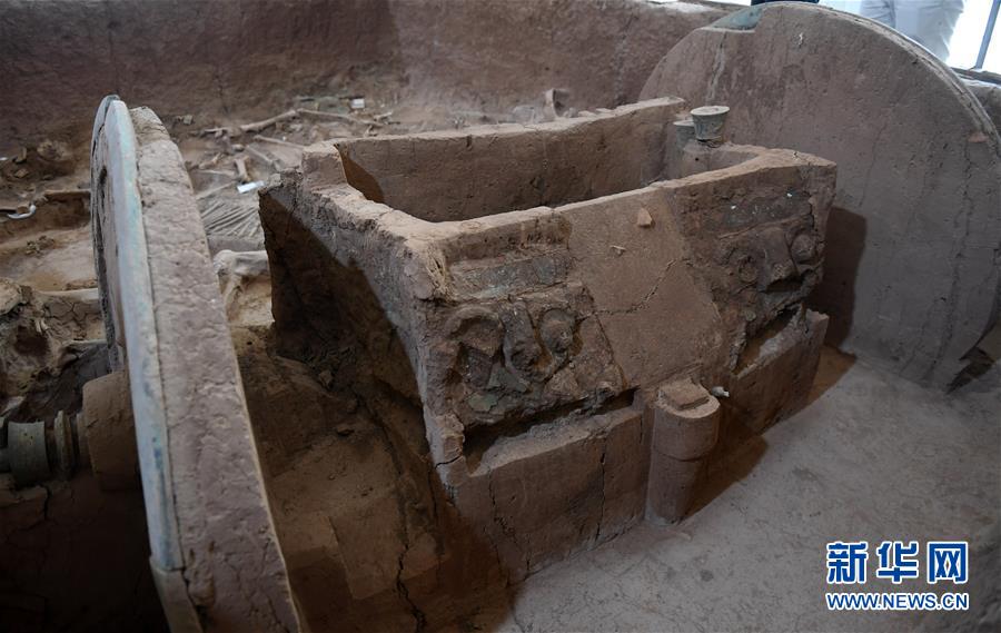 這是7月30日在陜西省考古研究院涇渭基地拍攝的西周晚期青銅輪牙馬車(chē)車(chē)廂部分。新華社記者李一博攝