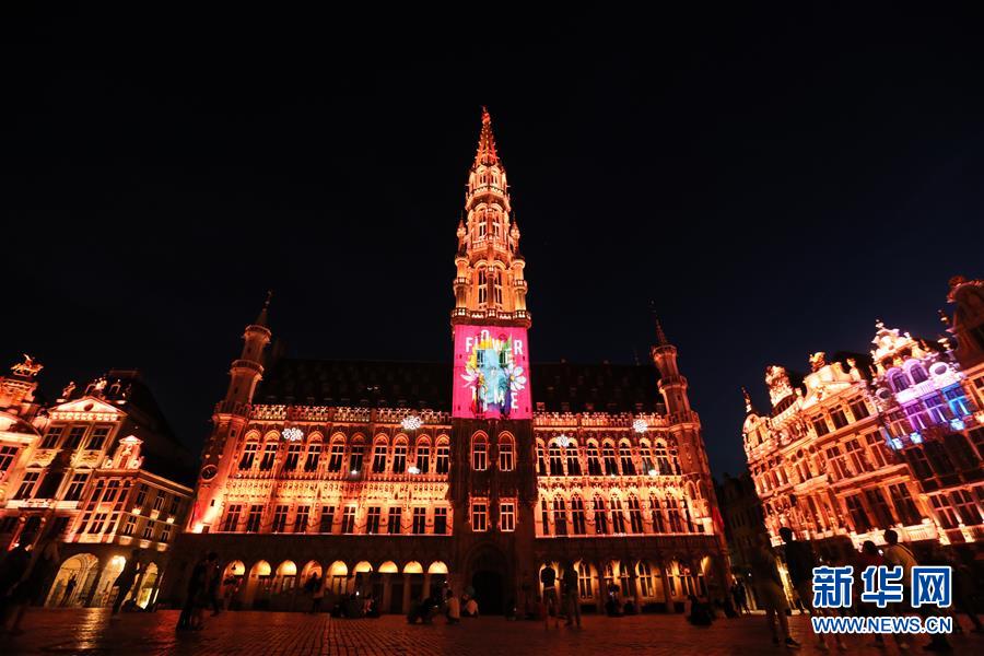 7月29日,人們在比利時布魯塞爾大廣場欣賞聲光秀,市政廳外墻上投射出“鮮花時光”的字樣。7月29日,比利時布魯塞爾大廣場舉行大型聲光秀。藝術(shù)家在市政廳等歷史建筑上投影文字和圖案,紀念這個夏天受新冠疫情影響而不能如期舉辦的文化活動。新華社記者鄭煥松攝