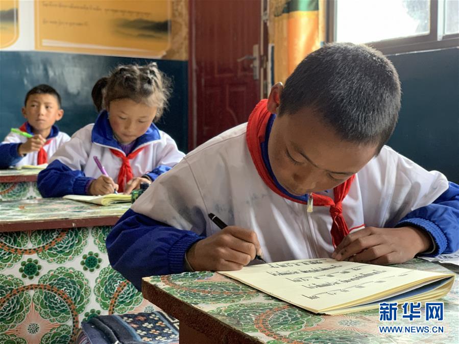 拉孜鄉(xiāng)中心小學學生在練習藏文書法(7月29日攝)。新華社記者唐弢攝