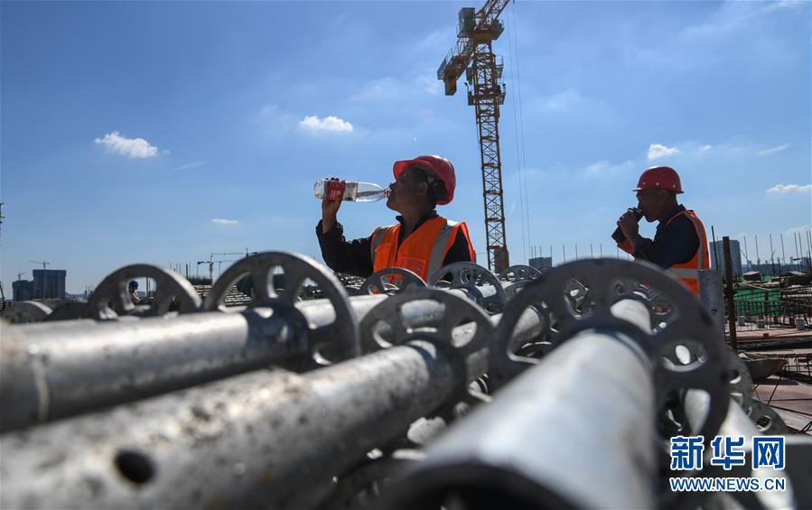 8月3日,工人在長江文創(chuàng)產(chǎn)業(yè)園項目工地休息喝水。進入8月,武漢迎來持續(xù)高溫天氣。在湖北廣電傳媒基地工程的工地上,中建三局總承包公司1500多名工人持續(xù)奮戰(zhàn),力保工程進度。該工程是我國中部地區(qū)首個國家級廣播影視媒體基地,由湖北廣電傳媒大廈項目、長江文創(chuàng)產(chǎn)業(yè)園項目、廣電生活配套項目三大板塊組成,總建設規(guī)模130萬平方米。自今年3月25日獲批正式復工以來,承建方克服困難,把因疫情影響耽誤的工期趕了回來,預計將按原計劃完成建設任務。新華社記者程敏攝
