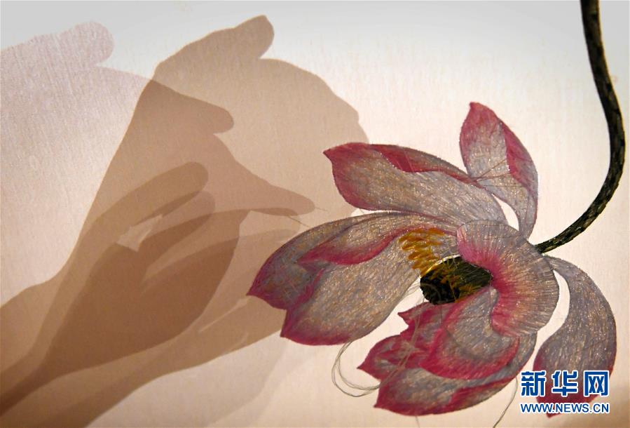在開(kāi)封市素花宋繡工藝有限公司的展示館里,王素花的徒弟劉冬紅在刺繡(7月30日攝)。新華社記者李嘉南攝