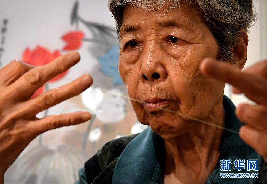 在開(kāi)封市素花宋繡工藝有限公司的展示館里,王素花在劈線(xiàn)(7月30日攝)。新華社記者李安攝