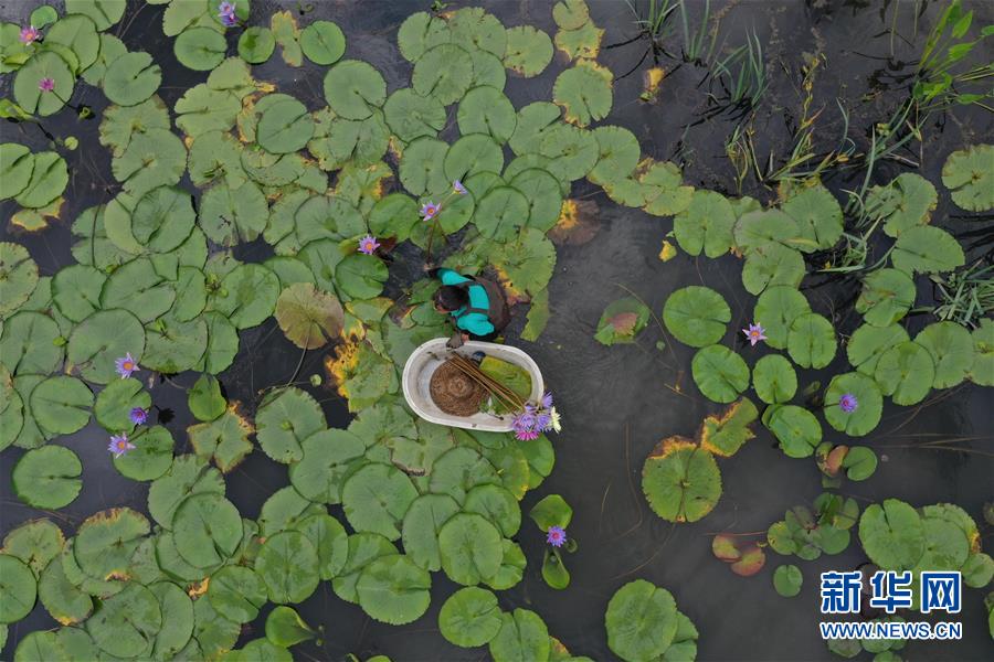 8月4日,藝溯家生態(tài)農(nóng)場工作人員在池塘采摘香水蓮花(無人機(jī)照片)。近年來,位于浙江湖州吳興區(qū)八里店鎮(zhèn)移沿山村的藝溯家生態(tài)農(nóng)場,在約45畝的傳統(tǒng)水產(chǎn)養(yǎng)殖池塘上規(guī)?;N植香水蓮花,既凈化水質(zhì),又提高了經(jīng)濟(jì)效益。農(nóng)場還設(shè)計出種植、采摘和加工香水蓮花的工藝流程,以面向更多農(nóng)戶推廣。新華社記者黃宗治攝