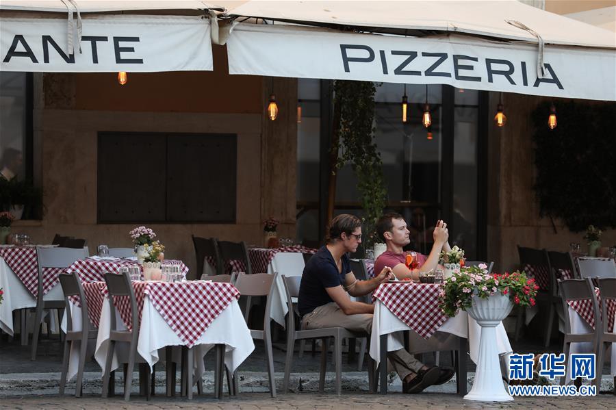 8月4日,人們?cè)谝獯罄锥剂_馬一家餐廳用餐。受新冠疫情影響,今年夏天羅馬的歷史中心區(qū)游客比往年明顯減少。新華社記者程婷婷攝