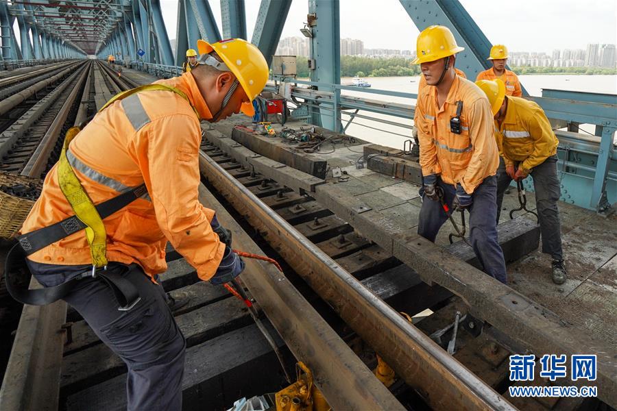8月6日,橋隧工郭繼浩(左二)和工友在南京長(zhǎng)江大橋作業(yè)點(diǎn)進(jìn)行更換枕木作業(yè)。