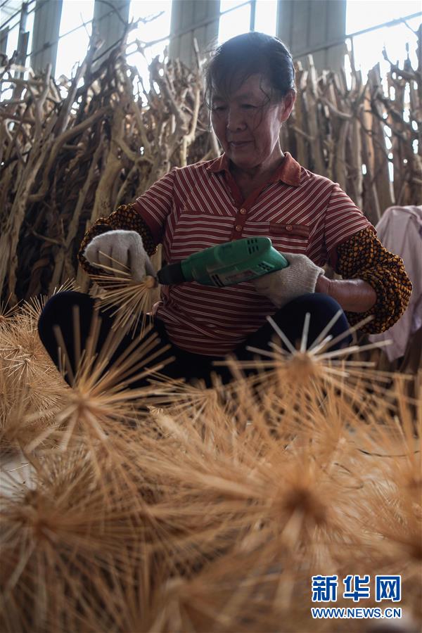 8月7日,工人利用柑橘樹枝加工吊燈飾品。2017年以來,廣西桂林市永??h永安鄉(xiāng)通過幫扶返鄉(xiāng)青年創(chuàng)業(yè)的方式,建立起根雕工藝品就業(yè)扶貧車間,組織貧困群眾進(jìn)車間務(wù)工學(xué)藝,把當(dāng)?shù)刎S富的朽木和柑橘樹根枝資源利用起來,加工成盆景、茶桌、吊燈等根雕工藝品,不僅幫助貧困群眾在家門口掌握一技之長,還讓他們在脫貧摘帽后實(shí)現(xiàn)穩(wěn)定增收。新華社記者張愛林?jǐn)z