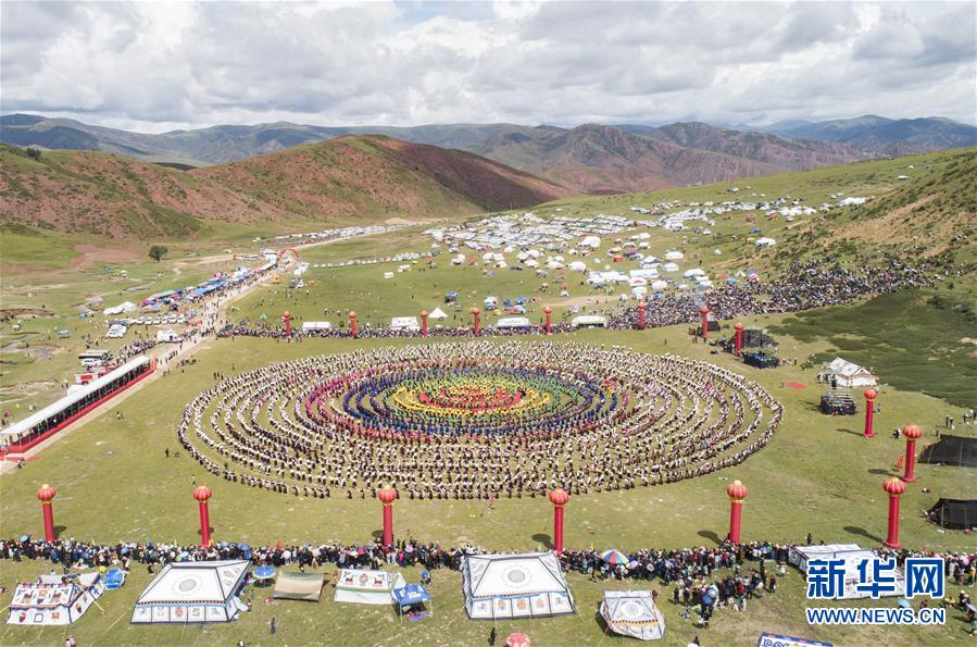 西藏首屆弦子舞展演現(xiàn)場(8月7日攝,無人機照片)。當日,西藏首屆弦子舞展演在昌都市芒康縣舉行。眾多演員同臺獻藝,表演國家級非物質(zhì)文化遺產(chǎn)弦子舞,吸引西藏各地的群眾前來觀看。新華社記者孫非攝