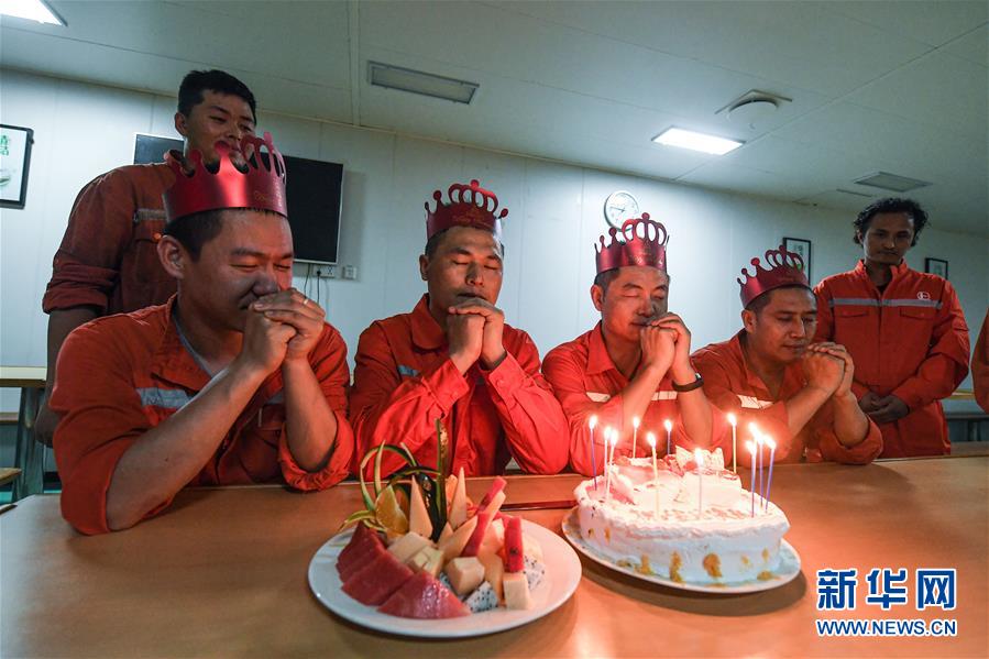 7月22日,在位于南海北部海域的勘探三號(hào)鉆井平臺(tái)上,4名鉆井工人在平臺(tái)餐廳里過集體生日。新華社記者蒲曉旭攝