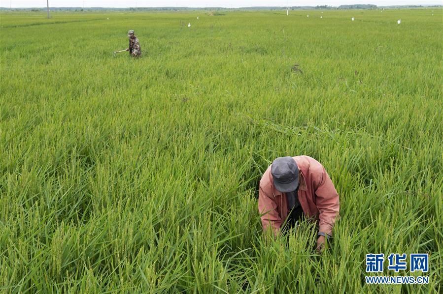 8月11日,農(nóng)民在撫遠市一處稻田中清除雜草。時下,“華夏東極”黑龍江省撫遠市的水稻長勢良好,蒼翠的稻田一望無際,猶如綠毯鋪在大地上。新華社記者謝劍飛攝。
