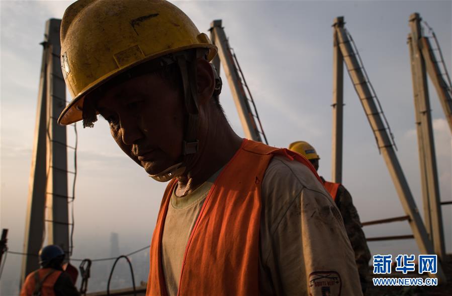 8月11日,工人在武漢綠地中心項目建設(shè)現(xiàn)場近500米的高空施工。新華社記者肖藝九攝