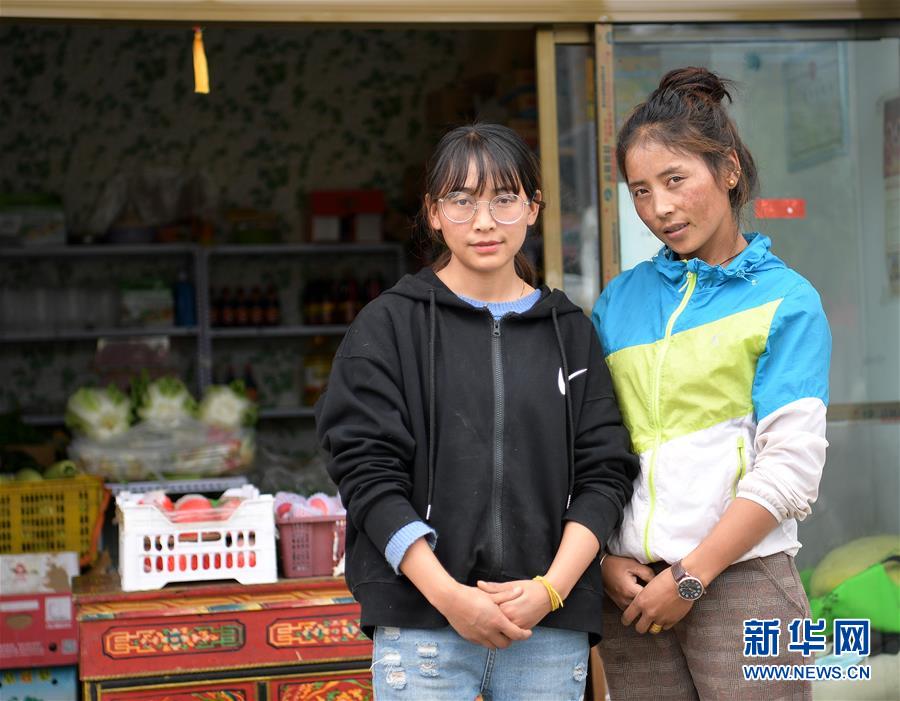 格桑旺姆(左)和姐姐德吉卓瑪在位于白朗縣的蔬菜店鋪前合影(8月3日攝)。