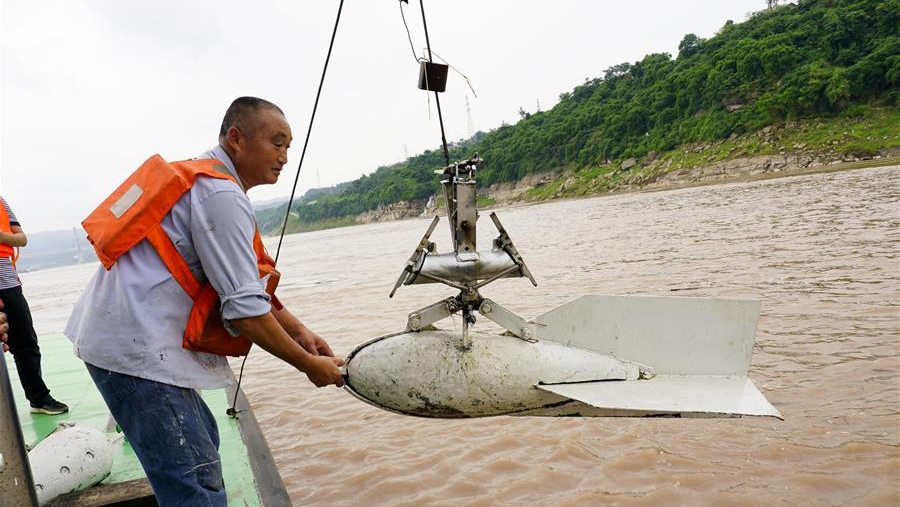 7月2日,在水文作業(yè)船上,長江清溪場水文站工作人員將水樣采集鉛魚放入水中。
