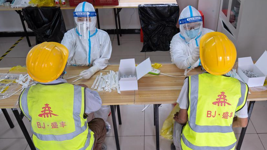 7月2日,在北京市大興區(qū)中建三局二公司北京公司一項目建筑工地的臨時核酸檢測采樣點,建筑工地人員排隊等候采樣。