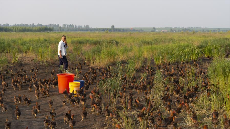 7月2日,在黑龍江省五大連池市的草原上,桑慶軍在三輪車上拋撒飼料喂雞。