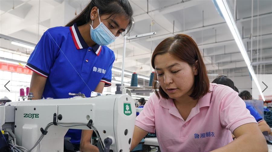 6月11日,在新疆喀什市一家服裝企業(yè)生產車間里,組長艾尼皮古麗·玉麥爾(右)在指導工人縫制布料。