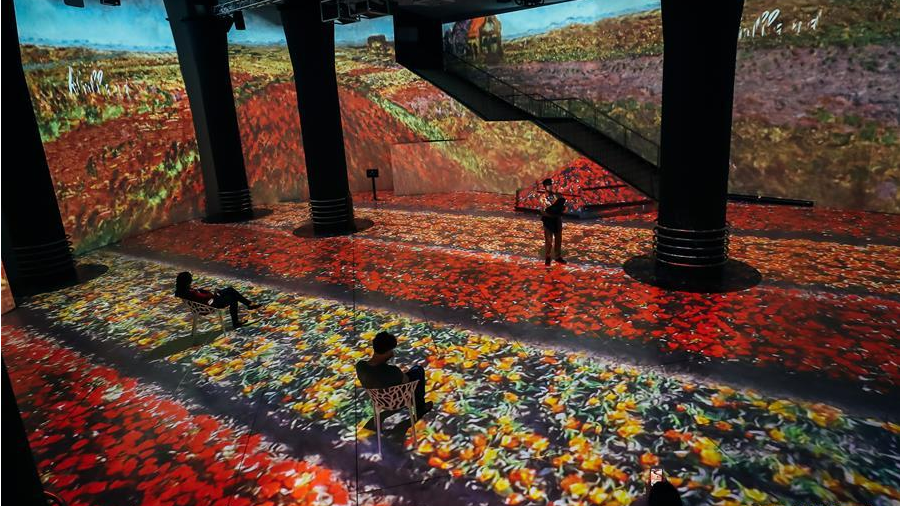 這是6月10日在比利時布魯塞爾拍攝的“沉浸式莫奈藝術展”現(xiàn)場。