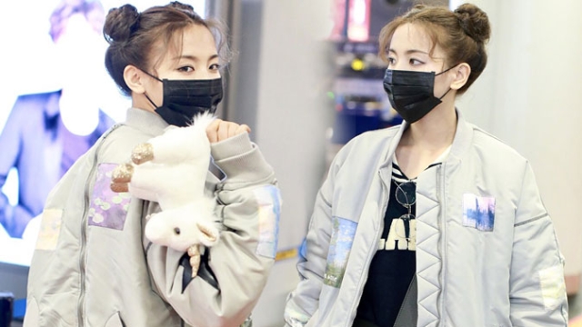 1月23日,北京,周冬雨現(xiàn)身機(jī)場。她用黑色連衣帽罩頭襯托巴掌臉,把下巴擱在行李車推桿上的雙手上呆萌可愛 。