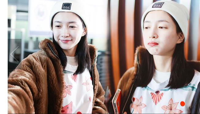 周冬雨連衣帽罩頭襯托小臉 下巴擱在行李車推桿呆萌可愛