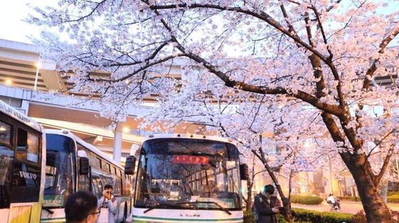 每到陽春三月櫻花爛漫的季節(jié),上海南浦大橋下的浦西公交樞紐一片盛開的櫻花。