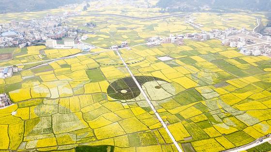 貴州黔南凱口鎮(zhèn),春暖花開,隨著氣溫逐漸升高,千畝油菜花田盛開,呈現(xiàn)出布依族青年男女圍繞太極圖的畫面。