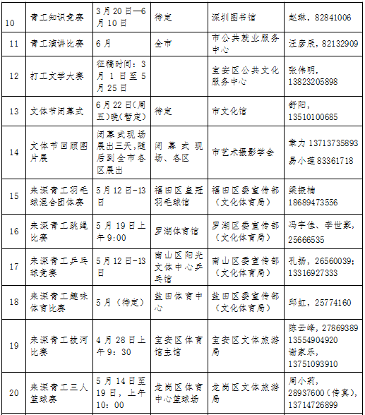 活動(dòng)期間,全市將舉辦25項(xiàng)全市性重要活動(dòng),分為6項(xiàng)活動(dòng),19項(xiàng)比賽。其中,6項(xiàng)活動(dòng)為開(kāi)幕式、“行走鵬城 感受深圳”惠民活動(dòng)、全市勞務(wù)工讀書(shū)成才巡回報(bào)告會(huì)、來(lái)深青工文體節(jié)回顧圖片展、閉幕式及優(yōu)秀獲獎(jiǎng)節(jié)目展演;19項(xiàng)比賽活動(dòng)分別是來(lái)深青工歌手大賽(全國(guó))、才藝大賽、攝影大賽(全國(guó))、美術(shù)大賽、書(shū)法大賽、知識(shí)競(jìng)賽、演講比賽、打工文學(xué)大賽(全國(guó))、羽毛球混合團(tuán)體賽、跳繩比賽、乒乓球競(jìng)賽、趣味體育比賽、拔河比賽、三人籃球賽、業(yè)余定向賽競(jìng)賽、登山比賽、棋類挑戰(zhàn)賽、趣味沙灘排球比賽、廣場(chǎng)健身操比賽。參賽對(duì)象主要為在深工作的18至50歲非深戶籍人士(不包括在各類文化演藝公司、培訓(xùn)機(jī)構(gòu)中從事文藝表演、培訓(xùn)的專業(yè)人員)。