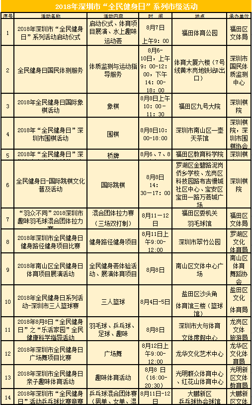其中,市文體旅游局將于8月7日,在福田體育公園舉辦全民健身日啟動儀式,屆時將有體育項目展演、水上趣味運動薈等項目上演。此外,全市還將組織舉辦適合不同人群的“全民健身活動展示”、“全民健身嘉年華”活動,如全民健身科普宣傳、咨詢輔導、項目推廣、交流展示以及比賽等;面向全市市民舉辦大型國民體質監(jiān)測、健身咨詢、大講堂等科學健身指導活動;引導和動員各級社會體育指導員開展義務健身輔導,利用豐富的體育專業(yè)技術知識,深入開展全民健身志愿服務活動,免費向市民開放市屬公共體育場館(深圳體育館、深圳游泳跳水館、深圳網球中心、深圳體育場等四家體育場館)等。