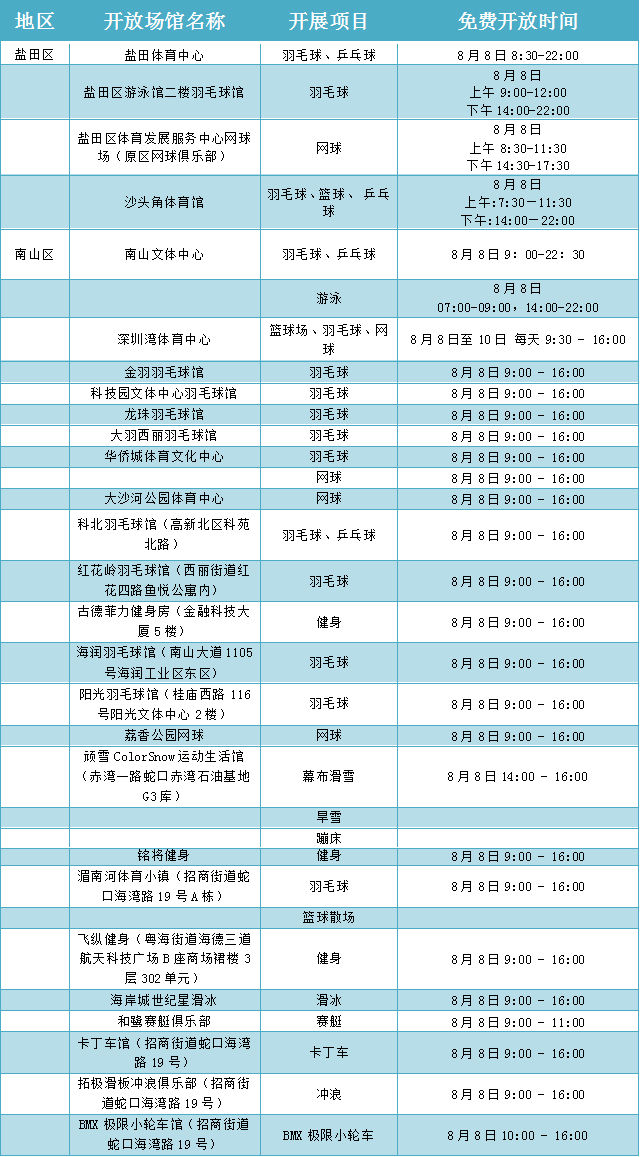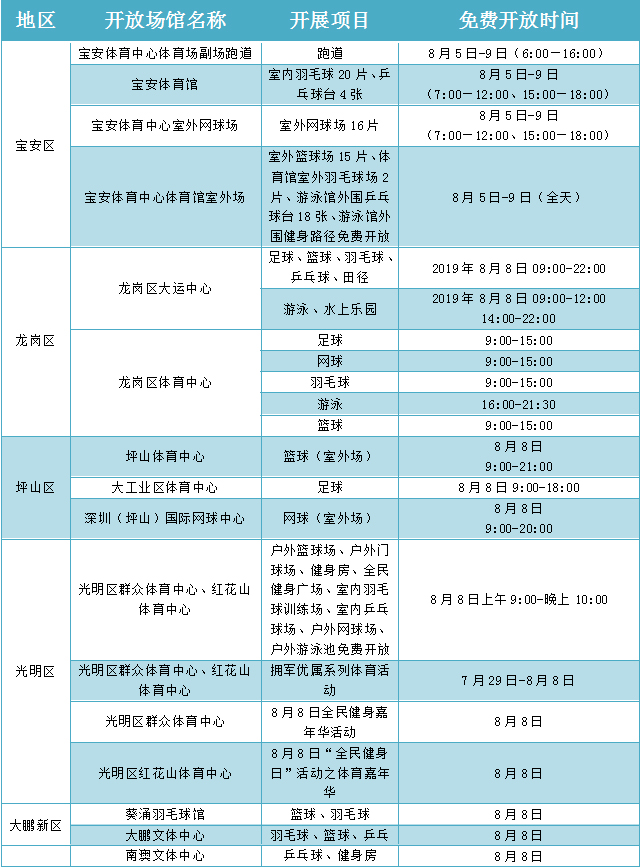 在“全民健身日”期間,深圳舉辦“全民健身嘉年華”及各類市級健身賽事活動16場,各區(qū)、各相關(guān)單位也結(jié)合實際,組織推出80余場全民健身運動,如面向全市市民的大型國民體質(zhì)監(jiān)測和健身咨詢活動、全民健身大講堂活動等。各級社會體育指導員也將開展義務健身輔導,利用豐富的體育專業(yè)技能,向廣大群眾講解健身知識,推廣健身方法,普及科學健身理念,為全民健身活動提供技術(shù)指導服務。8月8日“全民健身日”當天,深圳市體育中心以及各區(qū)體育場館,也將免費向市民或單位開放。