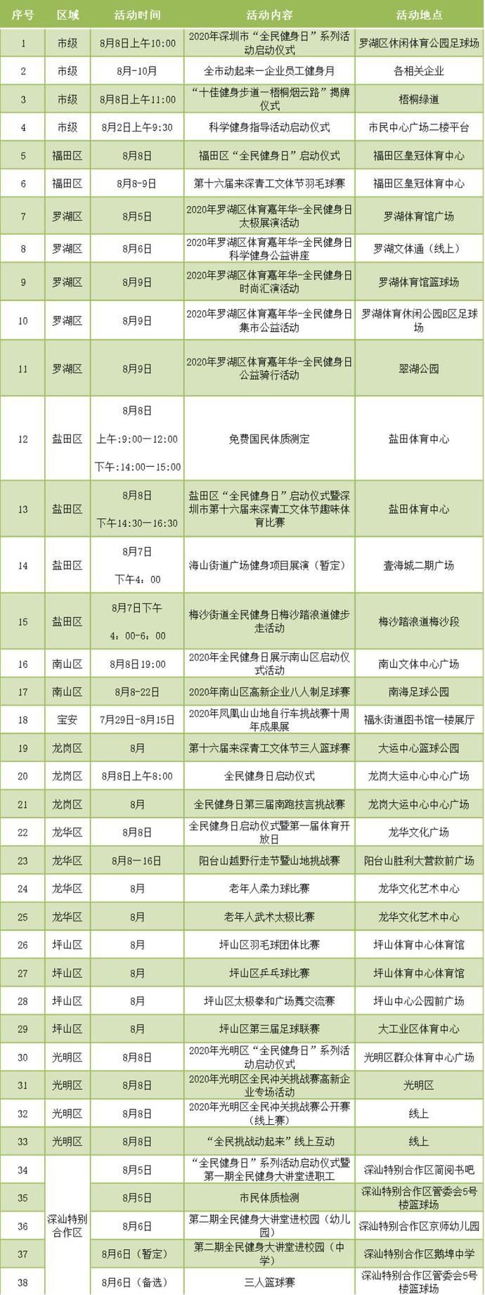 在啟動當日,全市各區(qū)也同步聯(lián)動,啟動了“全民健身日”系列活動。即日起至8月10日,深圳將陸續(xù)推出近40項全民健身運動系列活動,內(nèi)容涵蓋來深青工文體節(jié)、企業(yè)員工健身月、體育嘉年華系列展演、全民沖關線上挑戰(zhàn)賽、足球、籃球、老年太極、柔力球、國民體質(zhì)測定、全民健身大講堂、健身步道健步行等。此外,全市各公益體育館也將面向市民免費開放,大家可關注各場館進行預約。