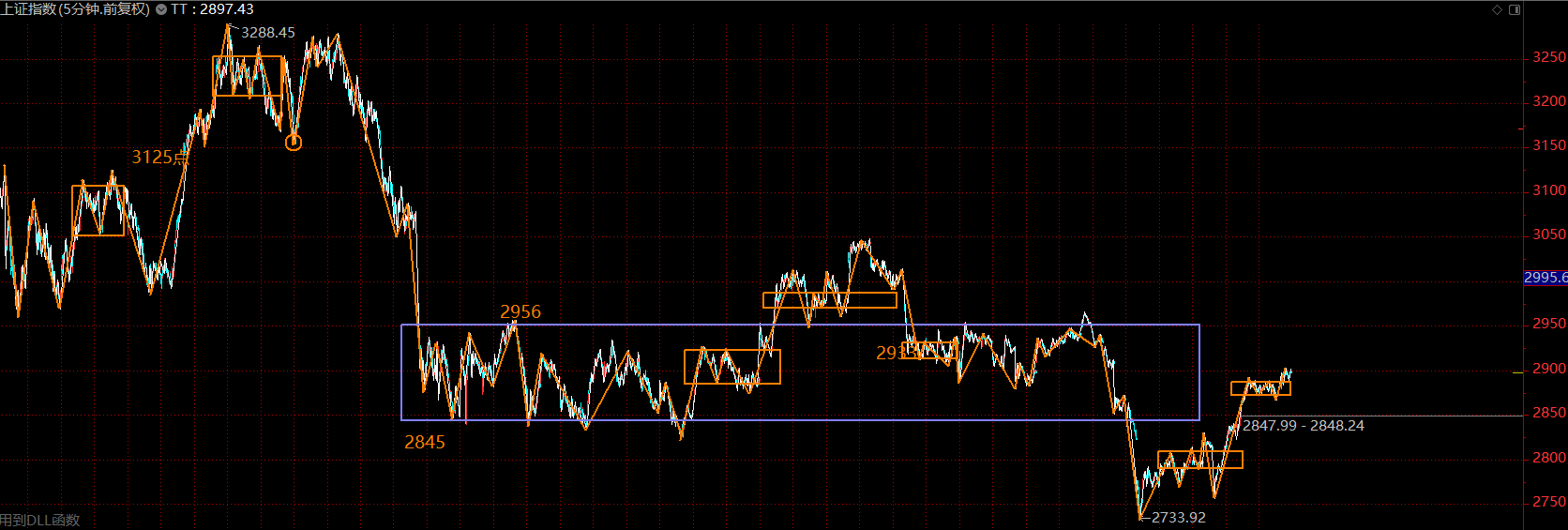 結(jié)合周五盤后的消息,這里五分鐘的上漲趨勢應(yīng)該已經(jīng)結(jié)束,市場強于預(yù)期,并沒有在中樞下方結(jié)束這段上漲趨勢,而且在中樞的中部,回落后,如果不創(chuàng)新低,則構(gòu)成大級別的二買,中期大行情可期。短期這里可能會面臨一波回落,周一早盤如果開在2845上方,則可持股不動,如果低于2845點,則可在上拉時適度減倉,后續(xù)在2733與2800之間擇機回補。