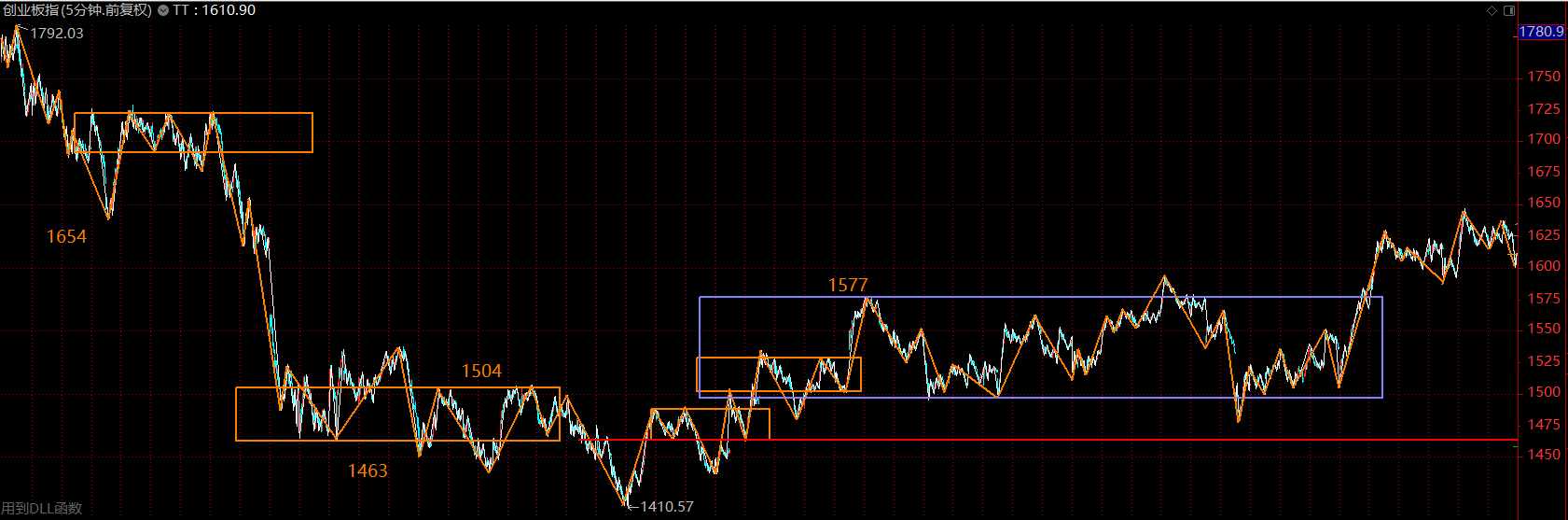創(chuàng)業(yè)板指數(shù)依舊強(qiáng)勢(shì),這里在構(gòu)建30分鐘級(jí)別的三買,以1577點(diǎn)為界,如果回調(diào)不破,則這里將是創(chuàng)業(yè)板主升行情的起點(diǎn)。如若重新跌回中樞內(nèi)部,則按中樞震蕩處理。創(chuàng)業(yè)板走勢(shì)要強(qiáng)于主板很多,后續(xù)行情多半仍然圍繞創(chuàng)業(yè)板展開(kāi)。