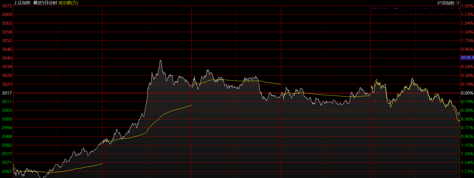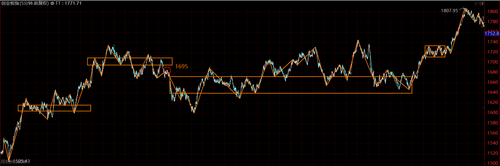 目前分析只需集中于這個五分鐘的上漲趨勢即可,上周如期做出了五分鐘上漲趨勢第二個中樞的雛形。前面幾天表現(xiàn)其實(shí)蠻超預(yù)期的,特別是科技股的逼空,A股似乎許久未見了。核心問題出在周五,周五有兩個點(diǎn)顯示出當(dāng)下市場的外強(qiáng)中干,第一個在于周五早盤南京證券反包漲停時,市場資金的失衡,明顯看出科技股與券商股兩臺“抽水機(jī)”從前幾天的互相配合變成了互相傷害;這一段跳水直接將圖形破壞,強(qiáng)度大的新高背馳可以說已經(jīng)沒有了,那下午上拉無力后的跳水也就在情理之中。