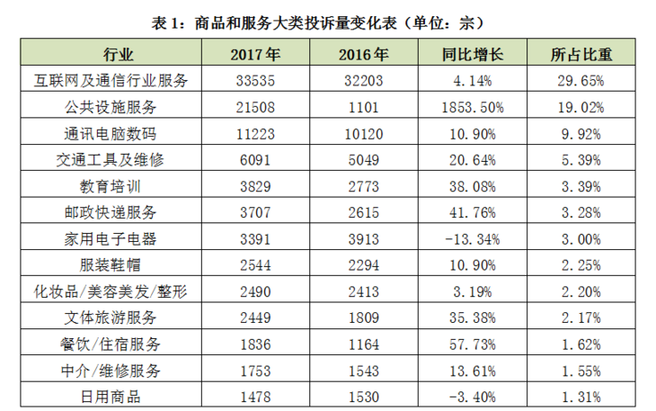 2017年,商品和服務(wù)二十五大類投訴中,互聯(lián)網(wǎng)及通信行業(yè)服務(wù)、公共設(shè)施服務(wù)、通訊電腦數(shù)碼投訴量居前三位,均超過1萬宗,分別占投訴總量的29.65%、19.02%和9.92%。