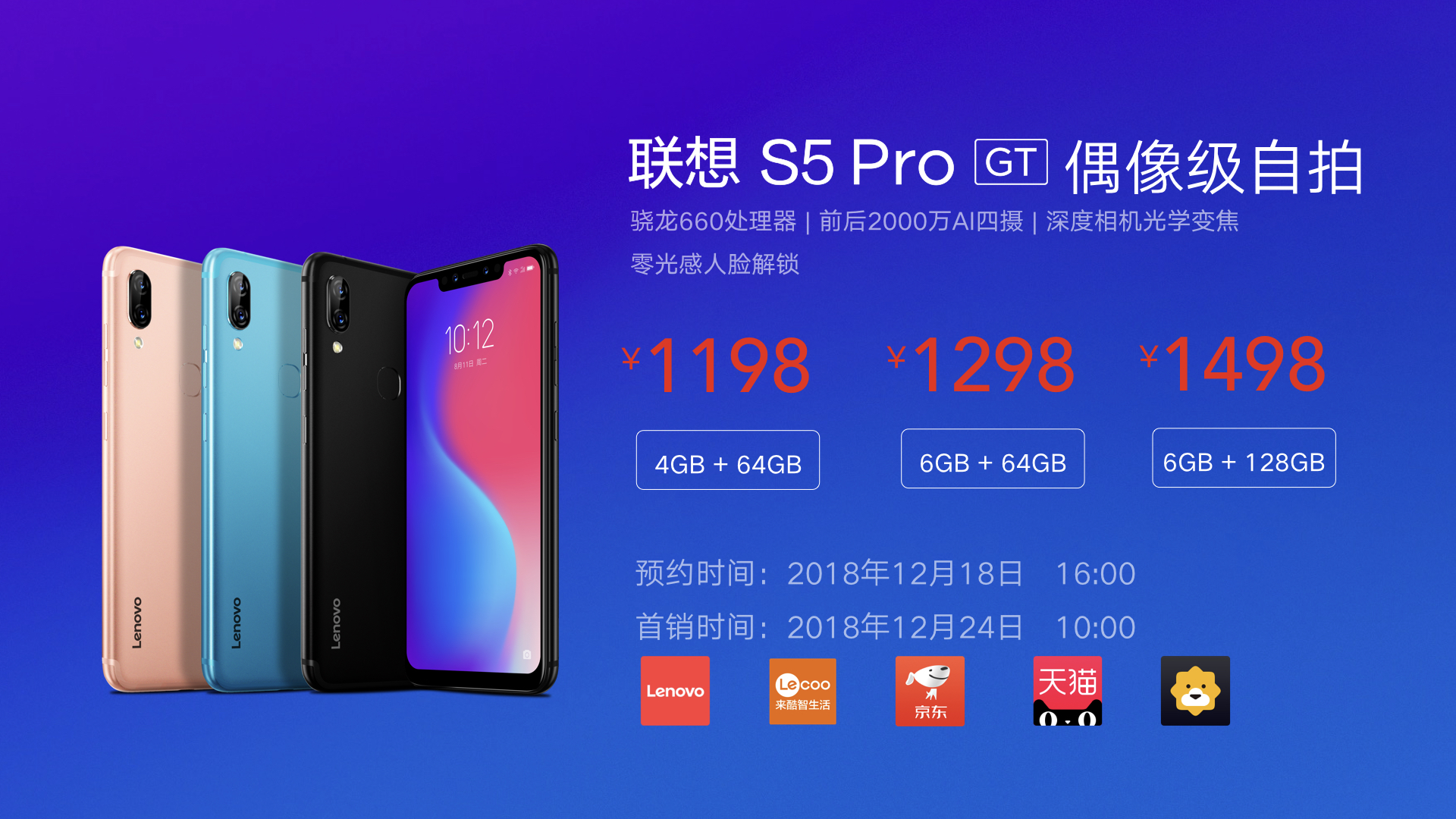 聯(lián)想S5 Pro升級版,配置升級,美麗升級,售價4 G+64G為1198元,6 G+64G為1298元,6 G+128G為1498元。12月18日在全平臺開啟預(yù)約,12月24日開啟首銷。
