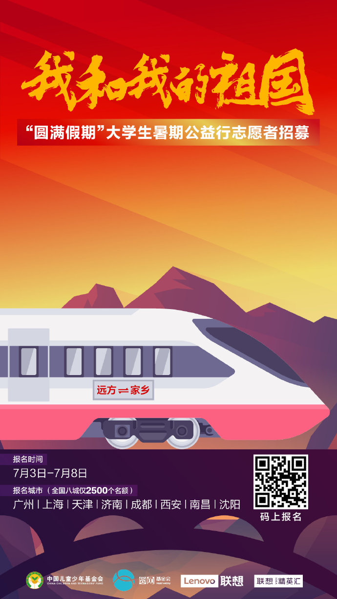 7月3日,由中國兒童少年基金會、北京圓網慈善基金會和聯想集團共同發(fā)起的“‘我和我的祖國’圓計劃—圓滿假期大學生暑期公益行”活動,面向全國8個城市的大學生正式開啟志愿者招募,邀請回鄉(xiāng)大學生加入到為廣大留守兒童群體量身定制的公益行動中,幫孩子團圓、為孩子圓夢、讓愛心圓滿。對于大學生來說,這將是一次獨特的公益實踐經歷。