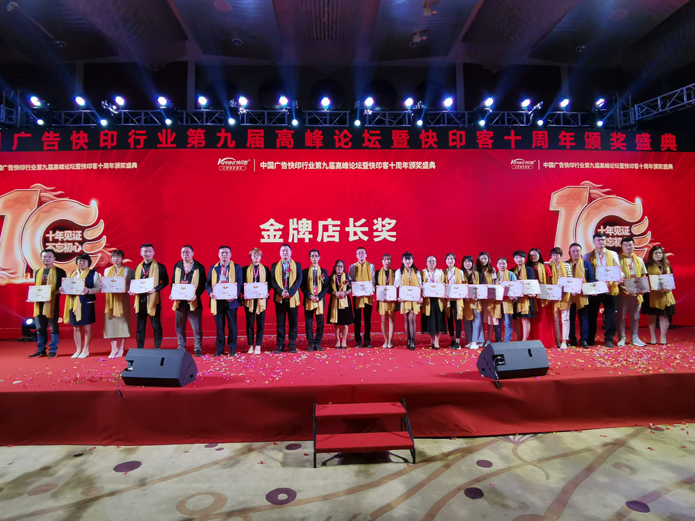2019年,也是快印客成立的第十年,作為廣告快印行業(yè)新模式的創(chuàng)造者和領(lǐng)航者,本屆高峰會“十年見證,不忘初心”為主題,向行業(yè)展示了快印客十年取得的豐碩成果,共同開啟下一個黃金十年,并向過去一年里為行業(yè)做出突出貢獻的公司和個人頒發(fā)了榮譽獎項。