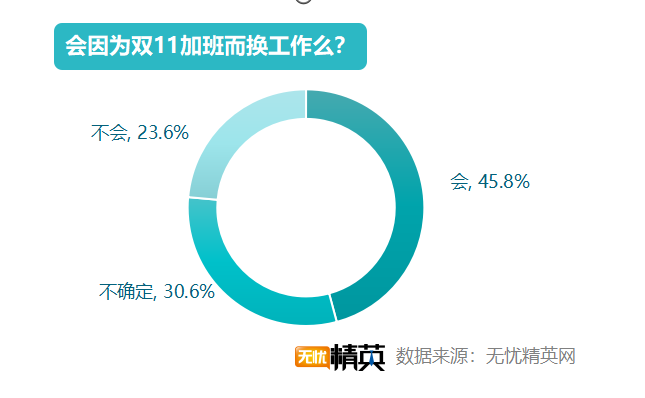 雙11過于辛苦,不少人會(huì)有工作上逃離雙11的想法。45.8%的職場(chǎng)精英因?yàn)殡p11加班過多,會(huì)有換工作的想法,不過,較2018年50.6 %的人有這種想法,已有所下降;30.6%的精英不確定要不要換工作,23.6%的職場(chǎng)精英則表示不會(huì)因?yàn)殡p11加班多而換工作。