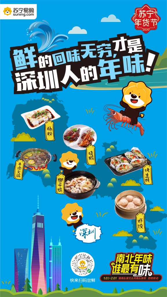 說起年味必提到年夜飯,中國(guó)地大物博每個(gè)城市的年夜飯各有特色,究竟哪個(gè)城市的年味最濃,各家眾說紛紜。為此華南、華中、華北具有代表性的四個(gè)城市紛紛站出來為各家城市的年味代言,深圳、武漢、長(zhǎng)沙、鄭州四城分別從年味、年俗、年貨、方言等方方面面為消費(fèi)者獻(xiàn)上了一頓年味大餐。那些記憶里存在的各色過年儀式,味覺里保留的故鄉(xiāng)味道,腦海里熟悉的地方鄉(xiāng)音,在這場(chǎng)年味比拼里一一重現(xiàn),喚醒了大家對(duì)于過年的期許,引發(fā)社交平臺(tái)上大家對(duì)于年味的分享。對(duì)于深圳這個(gè)移民大城往往被貼上沒有特色年貨的標(biāo)簽,其實(shí)不然,作為嶺南文化重要傳承地的深圳擁有眾多特色年俗。并且隨著越來越多的人選擇春節(jié)留在深圳過年,深圳的年味也越來越濃,因此深圳蘇寧在本次南北年味的話題中,不斷深挖深圳年味,打造了一張?zhí)厣某鞘写汗?jié)名片。