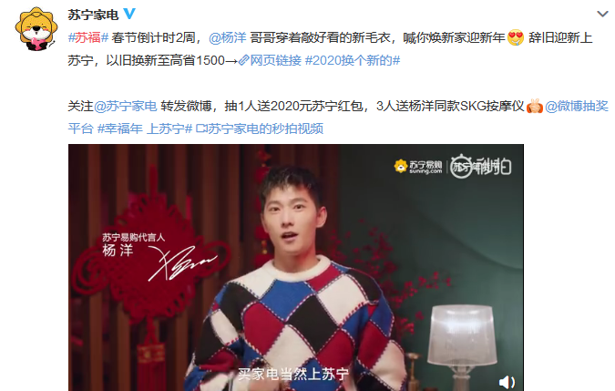蘇寧代言人楊洋和江疏影也給大家?guī)砹瞬簧俑@?,粉絲們繼續(xù)喊話愛豆,“過年就差一個楊洋了,萬一實現(xiàn)了呢”。蘇寧家電直接開啟鼠運來襲模式,粉絲參與微博互動,就有機(jī)會獲得2020元蘇寧紅包,還能獲得楊洋同款SKG按摩儀。