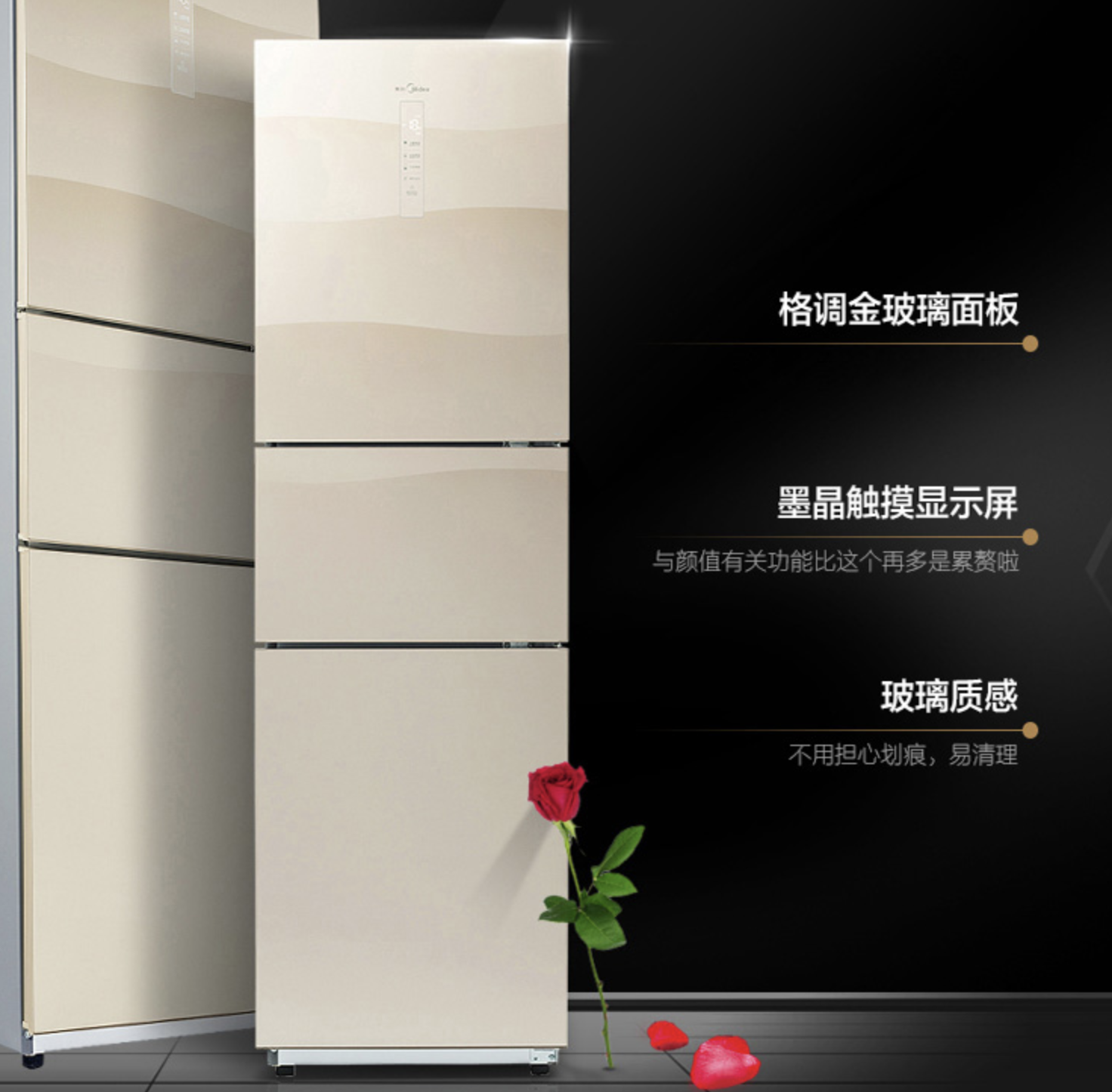 美的這款BCD-239WTGM三開門冰箱,產(chǎn)品采用金色玻璃面板與墨晶顯示屏,杜絕劃痕更有質(zhì)感,寬門設(shè)計(jì)、 隱藏暗把手、三溫區(qū)黃金比例。這款產(chǎn)品三溫區(qū)可單獨(dú)控溫,分為121升冷藏室、38升變溫室和80升冷凍室,讓儲鮮多樣化。此外,風(fēng)冷無霜減輕手動(dòng)除霜的負(fù)擔(dān),保持食物原始口感。